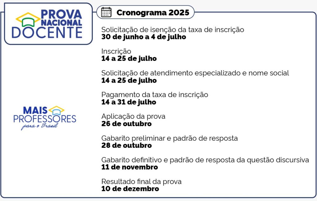 O Ministério da Educação publicou o edital da Prova Nacional Docente (PND).A avaliação, conhecida como Enem dos Professores, funcionará como um concurso nacional unificado para docentes da educação básica. É importante destacar que a PND não substituirá os concursos públicos, ela será uma alternativa de seleção que pode ser adotada por estados e municípios. As inscrições para o Enem dos Professores serão de 14 a 25 de julho, e a prova acontecerá no dia 26 de outubro. A divulgação do resultado final da prova será no dia 10 de dezembro.
